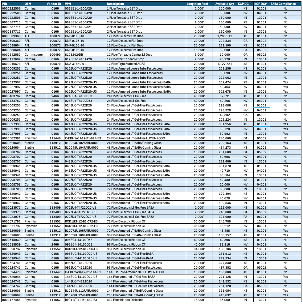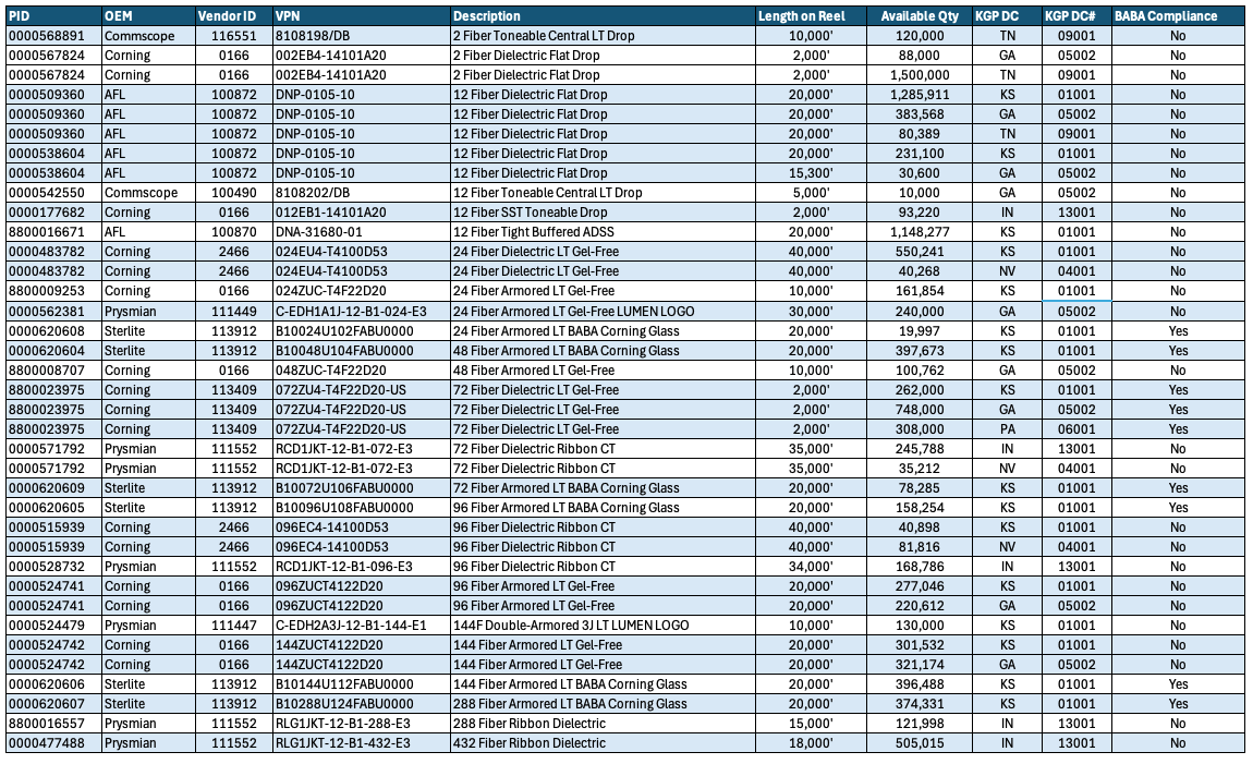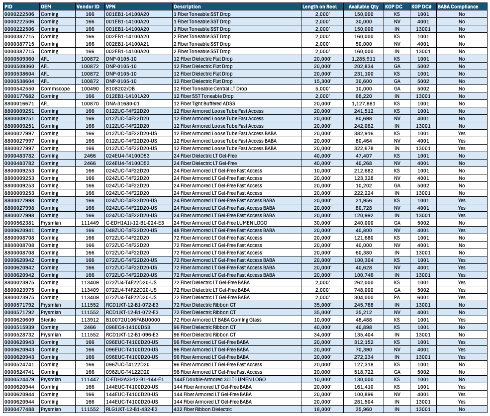 Browse our real-time inventory below, including part numbers, lengths, and available quantities, and secure the fiber you need today.
